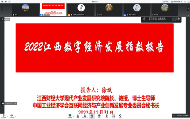 2022年12月31日,由中国工业经济学会互联网经济与产业创新发展专业委员会和我院、产业经济研究院、经济与社会发展研究院、中国工业经济杂志社、当代财经杂志社等联合主办的“2022数字经济与产业发展高峰论坛”成功举行。中国社会科学院工业经济研究所所长史丹、江西财经大学党委书记卢福财、华侨大学经济与金融学院院长郭克莎、湖南科技大学党委副书记刘友金、中央财经大学经济学院院长陈斌开分别发表主旨演讲,我院张利国院长主持论坛。中国社会科学院工业经济研究所所长、中国工业经济学会理事长兼常务副会长史丹研究员和我校党委书记、中国工业经济学会副会长卢福财教授分别致开幕辞。