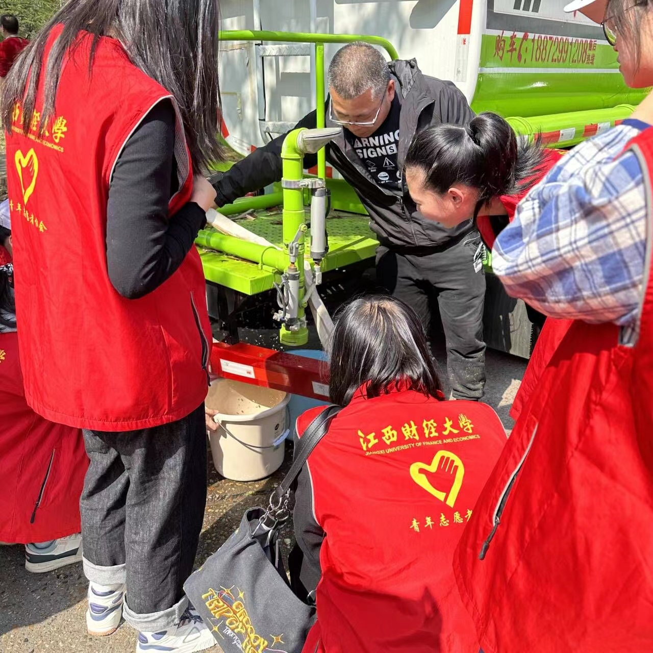 活动期间,经济学院青年志愿者协会的委员们为前来参与植树活动、辛苦劳作的同学们发放矿泉水,为烈日炎炎下的同学们带来一丝清凉。同学们齐心协力提水、互帮互助,细心浇灌小树苗。