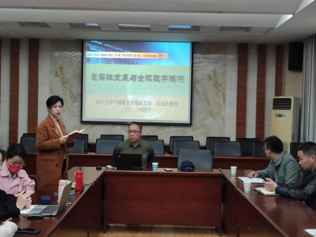 4月4日上午9点30分,我院开展了纪念江西财经大学百年校庆2023年第二次学术讲座,邀请到了浙江大学中国数字贸易研究院院长、《求是》特聘教授、国家二级教授马述忠教授在蛟桥园北区综合楼815会议室进行讲学,本次讲座的主题是:包容性发展与全球数字鸿沟,讲座由裘莹副教授主持,经济学院、应用经济学院(数字经济学院)师生踊跃参与。