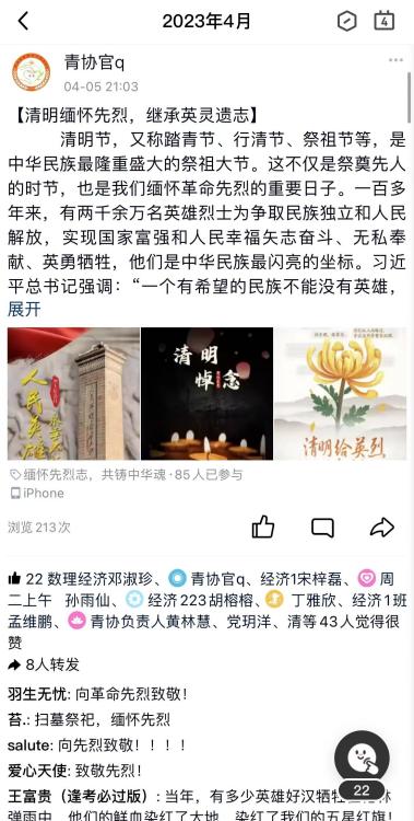 学生们在青协官Q活动期间所发的清明主题动态下进行点赞、留言、转发,积极与官Q进行交流互动,在弘扬英烈精神、赓续红色血脉的同时,也有利于在我校形成缅怀革命先烈,文明祭祀新风的浓厚氛围。