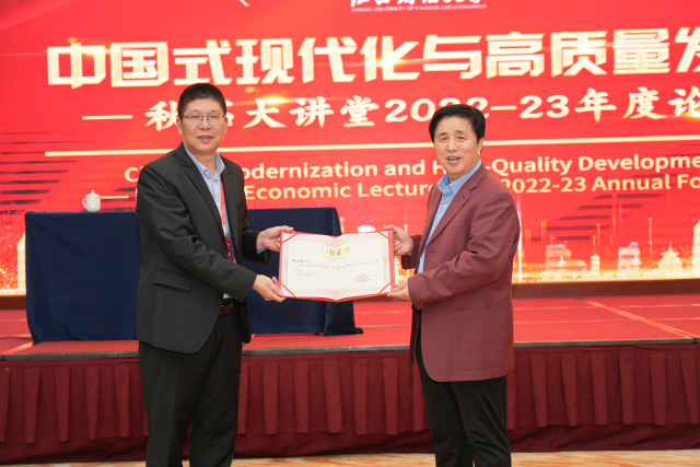 会议结束后,江西财经大学经济学院院长张利国代表学院为王秋石教授颁发从教四十周年荣誉证书,以感谢王教授为学院发展及学科建设做出的巨大贡献。并与前任院长陈富良及陆长平教授共同合影留念。