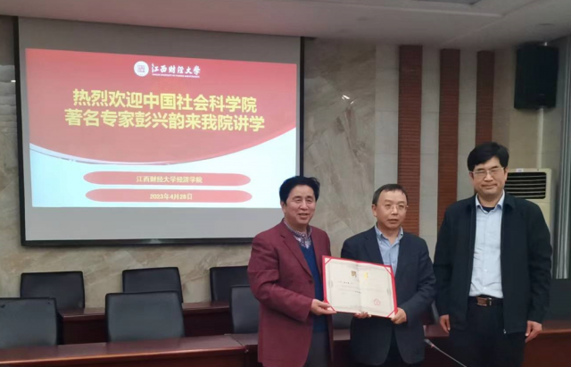 彭兴韵研究员是我院杰出校友,鉴于本人卓越学识和为我院作出的突出贡献,学院决定聘请彭兴韵研究员为我院客座教授。江西财经大学原副校长王小平教授向彭兴韵研究员颁发聘书。
