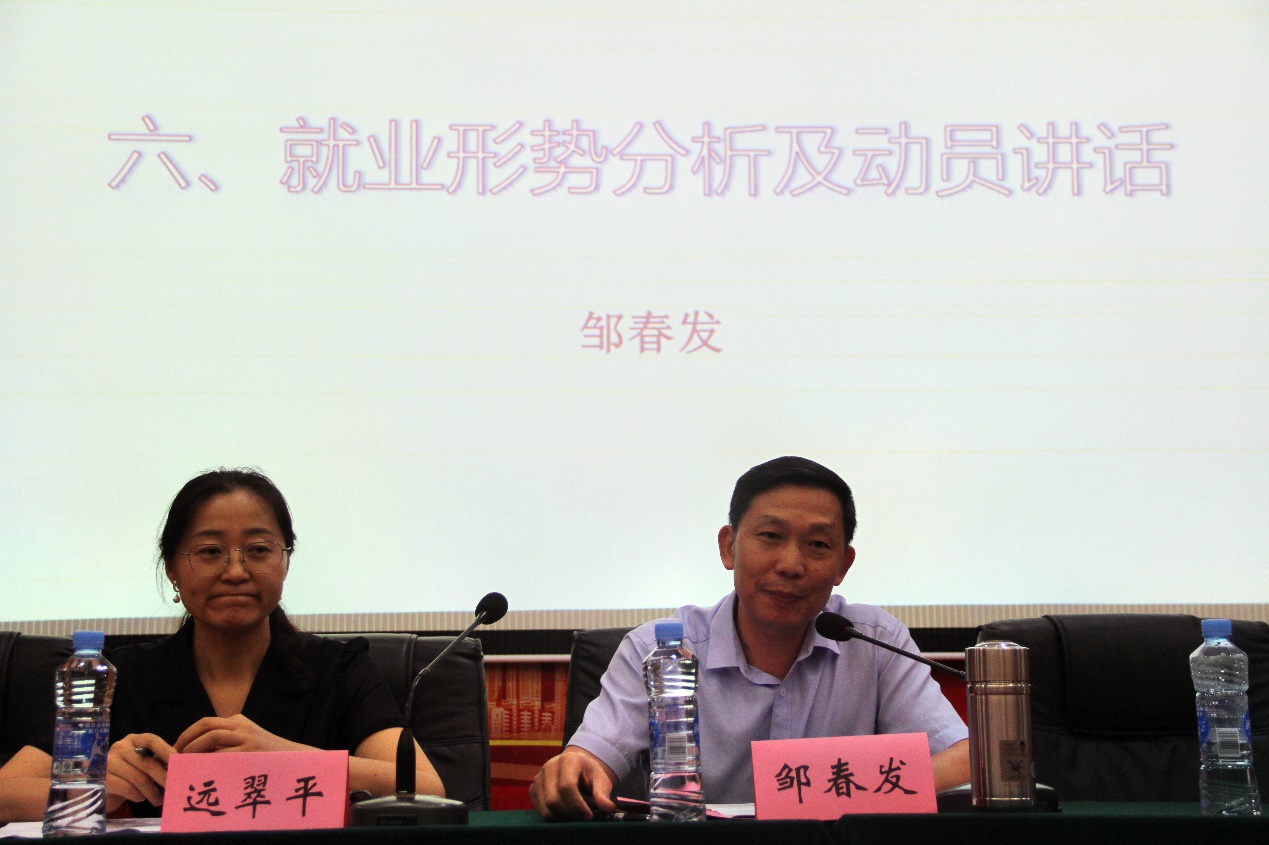会上,党委书记邹春发以数据为支撑,结合高校毕业生就业工作中存在的问题以及学院学科专业特点向同学们深刻解读了2024届毕业生就业形势,指出要进一步增强紧迫感和危机感、夯实专业基础和全面提升综合素质,尽早做好职业规划。他提出四点建议和意见:一是了解就业形势,清楚认识求职、考研、考公考编、出国留学的目前形势;二是明确就业的方向,并从社会、家庭、学校、个人方面分析了就业的重要性,希望同学们能做好就业规划;三是充分做好求职准备,从三个方面、四个关键点对同学们进行了指导;四是克服思想误区,多了解各方信息,避免定位过高。