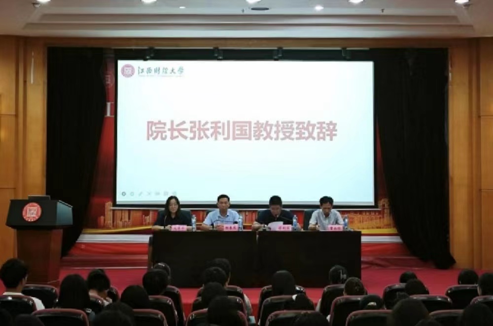 张利国代表学院全体师生对2023级新生的到来表示热烈的欢迎。他从经济学院的历史、专业、师资力量、科研成果等等方面对学院情况做了详细介绍,并对即将开启大学生活的2023级新生提出三点希望:一是希望同学们以“归零”的心态投入人生的新阶段;二是希望同学们规划好在江财的时光;三是希望同学们做“信敏廉毅”的江财人。