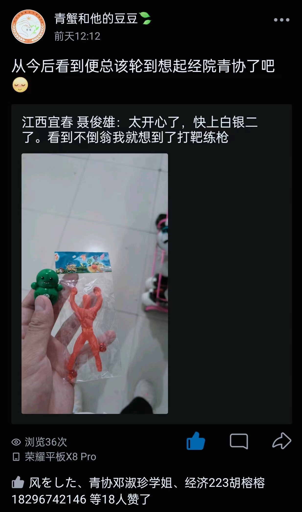 活动后期,青年志愿者协会官方QQ为每一位@它的参与者点赞、评论以及转发,让参与者再次感受活动的欢乐与温馨,带给同学们更多的惊喜和欢乐。