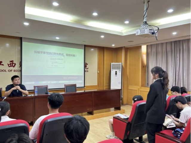 In the interactive session, alumnus Xiao Jian and alumnus Du Bin, who graduated from the School of Economics 05 majoring in economics and is now the vice president of Shenzhen Bafuyuan Capital Group, answered the students' questions and gave them detailed answers from their own growth experience about study, career planning, internship, innovation and entrepreneurship, and how to become a composite talent.