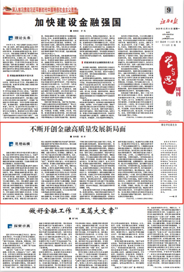 在近期举行的中央金融工作会议上,习近平总书记从党和国家事业发展全局的战略高度,部署当前和今后一个时期的金融工作。这次会议明确提出要加快建设金融强国,以金融高质量发展助力强国建设、民族复兴伟业。12月11日,《江西日报》理论版专题刊载了我院院长张利国教授、杨洋博士的理论文章《不断开创金融高质量发展新局面》。