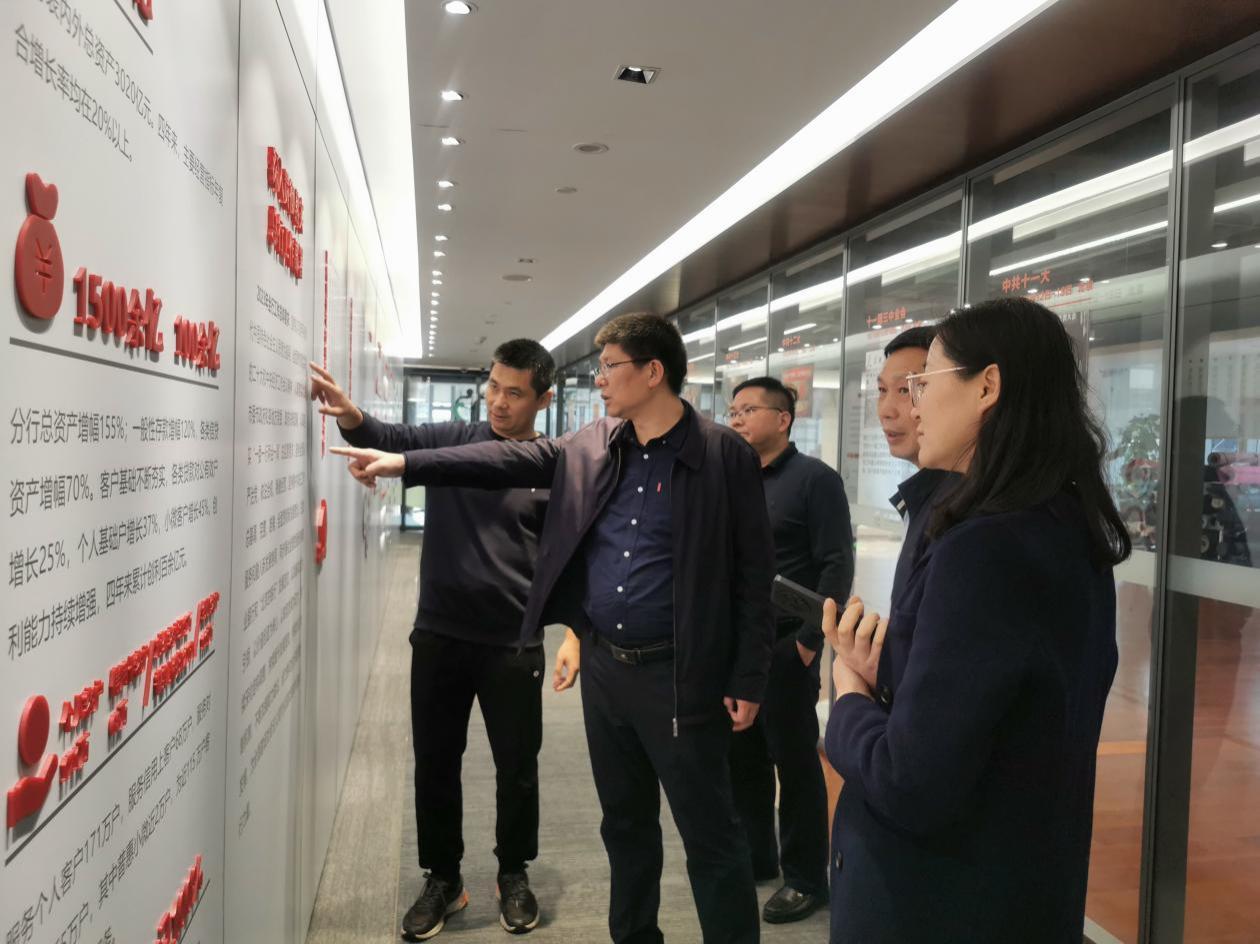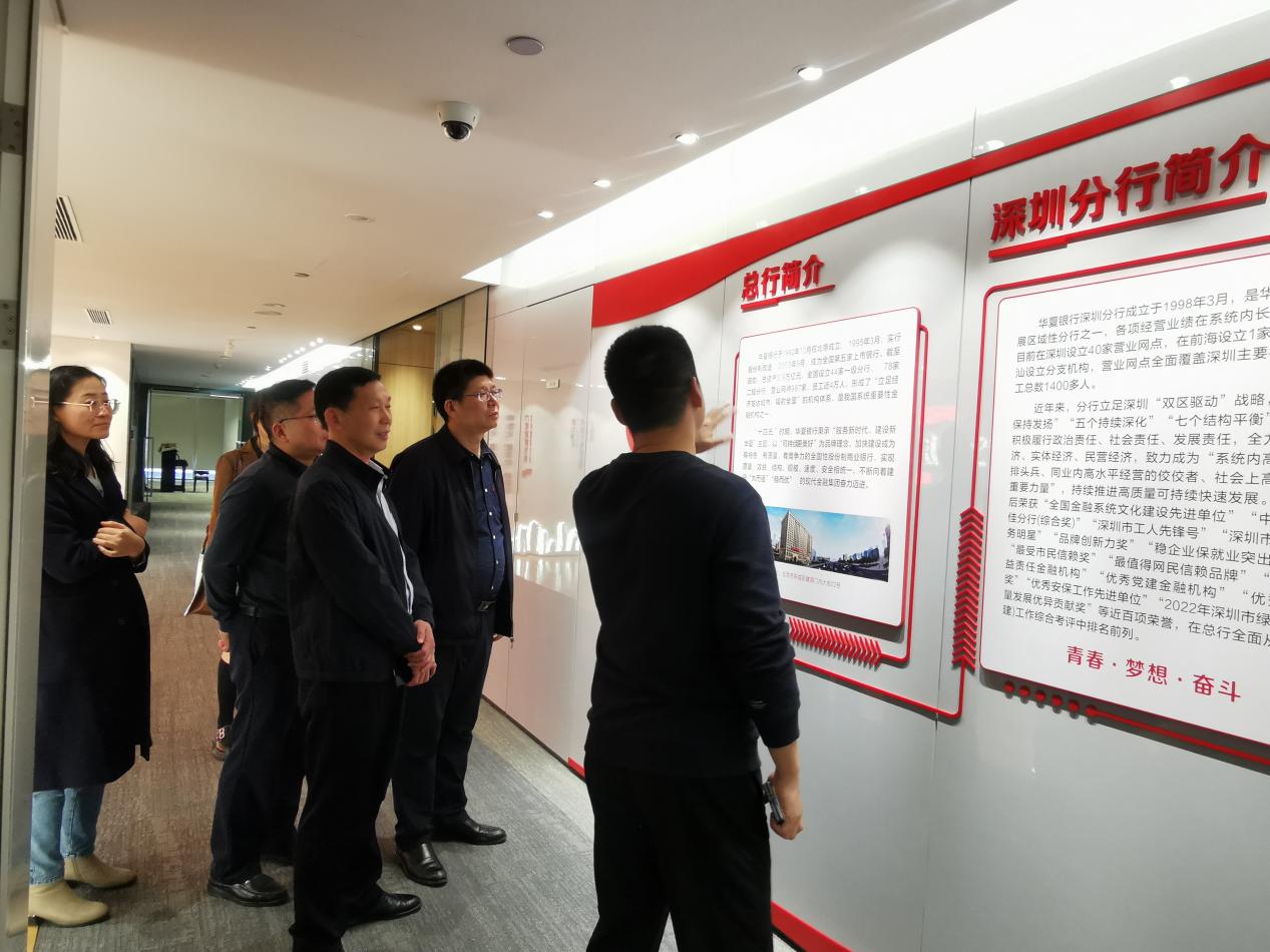 在华夏银行深圳分行,公司业务部总经理兼战略客户部总经理肖建带领学院一行参观了党群服务中心,员工之家、办公场所,肖建总经理介绍了公司文化、党建特色、公司的发展愿景、经营理念,双方就校企合作、吸纳学院毕业生实习实践、联合育人、党建联动等事项进行了深入沟通和交流。
