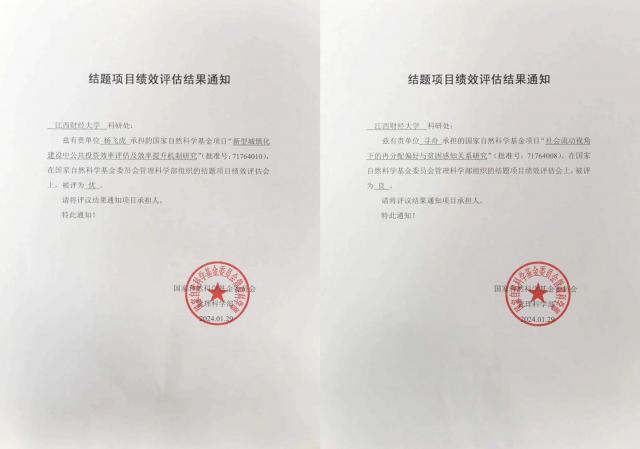 近日,接国家自然科学基金委员会管理科学部通知,由我院杨飞虎教授承担的国家自然科学基金项目“新型城镇化建设中公共投资效率提升机制研究”(批准号:71764010)、寻舟博士承担的国家自然科学基金项目“社会流动视角下的再分配偏好与贫困感知关系研究”(批准号:71764008),在国家自然科学基金委员会管理科学部组织的结题项目绩效评估会上,分别被评为 优、良 。