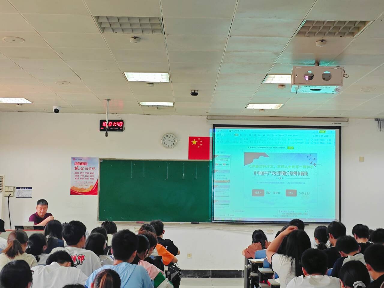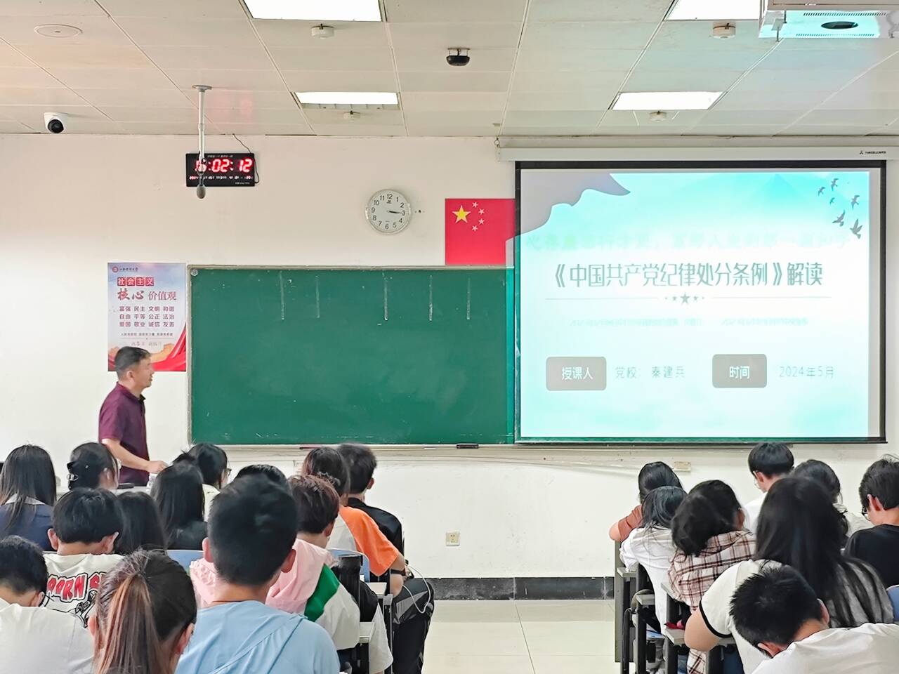 2024年5月15日下午,江西财经大学经济学院于第五教学楼5122开展了入党积极分子培训班第七讲,主题为《中国共产党纪律处分条例》解读,由党校副校长秦建兵主讲。