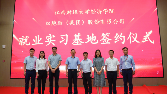 6月20日,经济学院与双胞胎(集团)股份有限公司隆重举行就业实习基地签约仪式,标志着双方在校企合作、人才培养方面迈出了坚实的步伐。双胞胎(集团)股份有限公司饲料与服务产品线总裁、经济学院03国管班校友张昭胜、产品线干部部长王称位、人力行政中心部长石贺龙、人资专员吴标;经济学院党委书记邹春发、党委副书记远翠平、就业专员钟义鹏等共同出席活动。