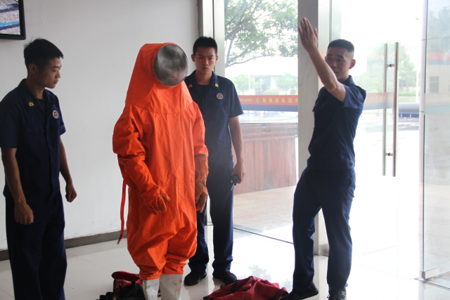 在消防队员的引领下,同学们参观了各种消防救援装备和器材,使同学们了解消防战士在救援行动中所使用的装备和器材。在队长的帮助指导下,同学们穿上消防服、佩戴消防头盔亲身体验了作为消防员的感觉。