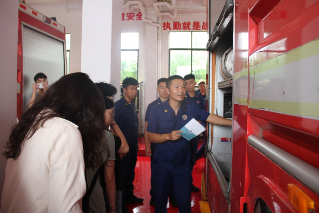 最后,同学们来到消防大队园区,近距离观看了消防队员如何在50秒内完成出警,深入了解了消防队员们的日常工作职责,更深刻体会到消防员们过硬的专业素质和本领。