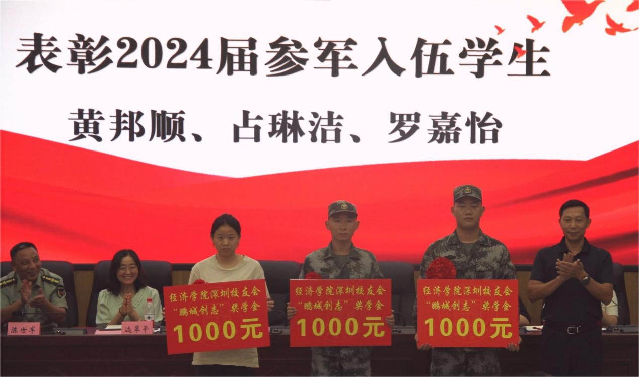 会上,表彰了2024届参军入伍学生,学院领导为他们佩戴大红花并颁发“鹏城励志奖学金”。