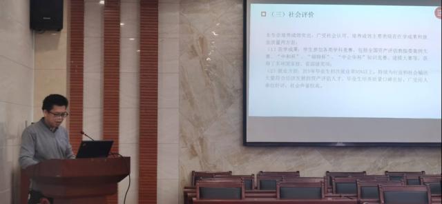我院余炳文副院长从学科概况、目标与标准、学位授权点基本条件、人才培养、服务贡献五个方面介绍了本学位授权点的基本情况,并列举了相关支撑材料。但他也指出,在资产评估专业学位的学科建设过程中存在一些问题需要持续改进,如校外实习基地有待落实和拓展、研究生培养质量有待提升、学科建设投入仍要加强等。余炳文副院长诚恳地请求与会专家对江西财经大学资产评估专业学位发展提出宝贵的指导意见。