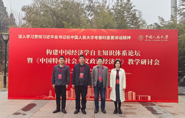 2025年3月1日至2日,由高等学校哲学社会科学教材研究国家教材建设重点研究基地指导,中国人民大学经济学院和中国人民大学全国中国特色社会主义政治经济学研究中心主办,中国人民大学出版社协办的构建中国经济学自主知识体系论坛暨《中国特色社会主义政治经济学》教学研讨会在中国人民大学成功举办。会议围绕中国经济学自主知识体系建构、《中国特色社会主义政治经济学》的教学内容、方法创新等议题深入研讨交流,以期推进中国经济学教育的繁荣发展。来自教育部教材局和高教司的领导、中国人民大学、北京大学、中央民族大学、北京师范大学、复旦大学、厦门大学、中山大学、上海财经大学、西南财经大学等多所高校和研究机构的院长和负责《中国特色社会主义政治经济学》课程授课的教师代表参加此次会议。我院张利国院长、彭继权副教授、孙广召博士和位晓琳博士一同参加了此次会议。