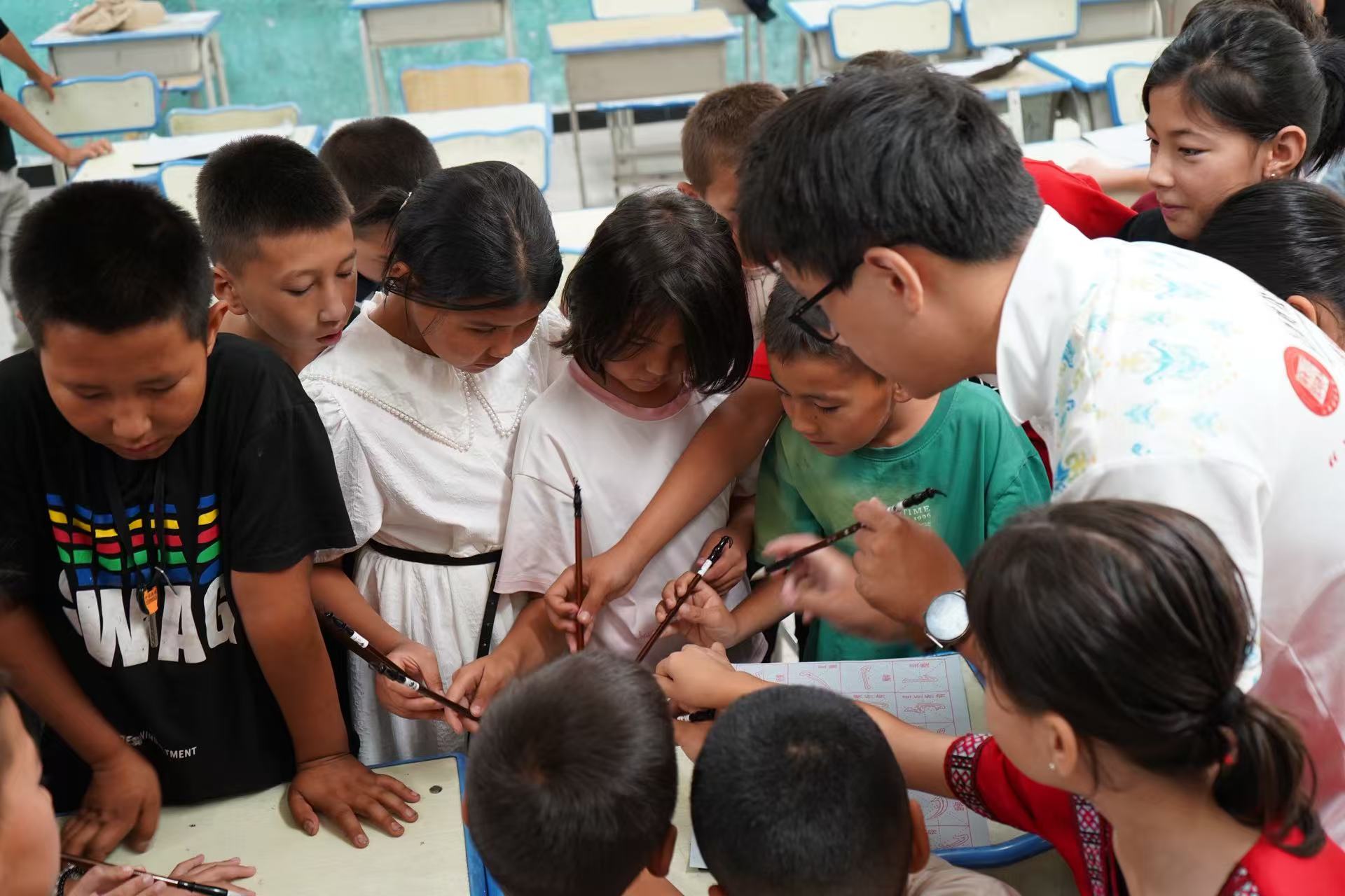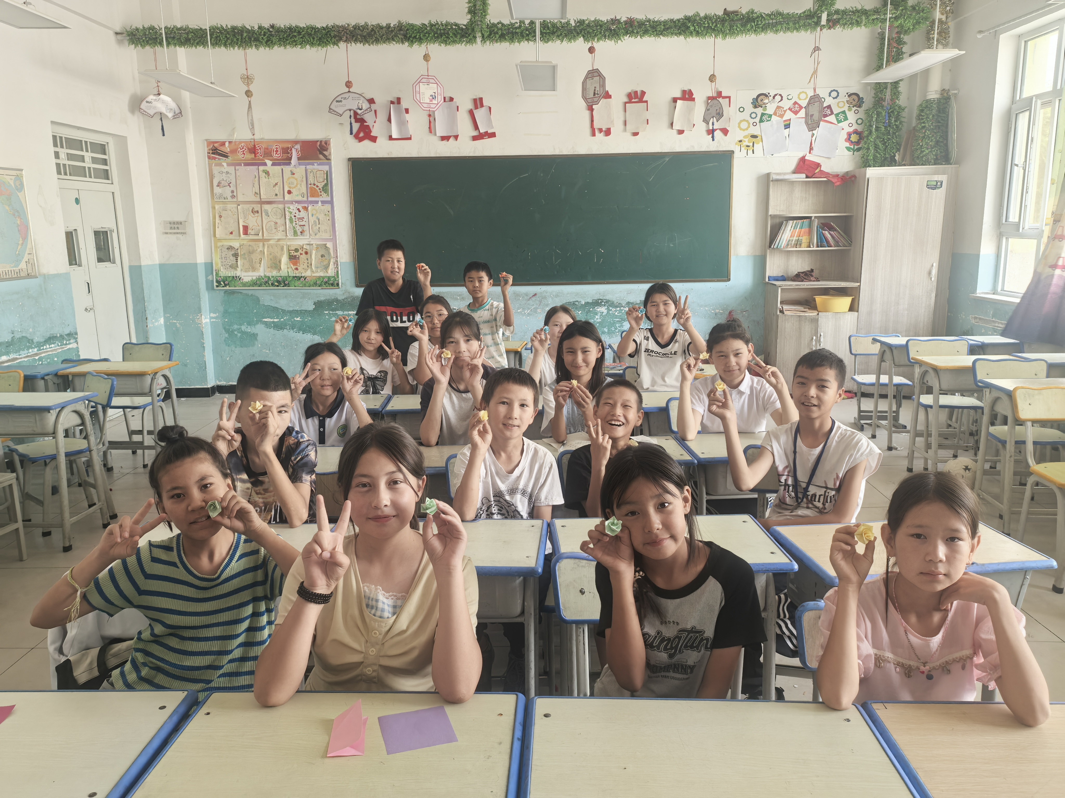 江西财经大学江新比心实践团开展七彩假期美育支教活动 为铸牢中华民族共同体意识,江西财经大学“江新比心”民族团结实践团自7月12日起在新疆阿克陶县丝路佳苑小学开展“七彩假期”美育支教活动。校园里洋溢着欢声笑语,实践团通过丰富多彩的课程,为当地孩子们带来一个充满创意与温情的暑假。 创意手工课:巧手传情谢师恩 在手工教室里,孩子们正全神贯注地制作着各种手工作品。扭扭棒课堂上,五彩的扭扭棒在孩子们手中变成了展翅的和平鸽;粘土课上,一团团彩泥捏出了孩子们梦想的家;折纸课上,一张张彩纸经过折叠变成了鲜艳的玫瑰花。“老师,玫瑰花送给您!我们喜欢你您”,课后,孩子们争先恐后地将自己的作品送给支教老师。一位初一学生捧着着自己做的折纸孔雀说:“我要把这个送给江西来的老师,感谢他们教我们这么多有趣的知识。”