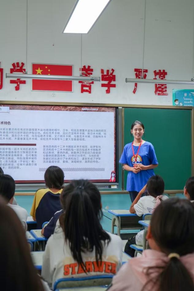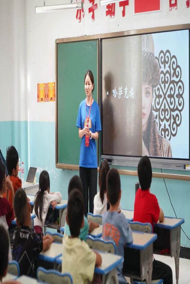 为保障教学质量,实践团根据学生年龄和学业水平,将报名参与的孩子们分为四个班级,实施针对性教学。第一课以“多彩民族·同心同行”为主题,队员们通过生动讲解、图片展示和互动问答,向孩子们介绍了哈萨克族、维吾尔族等少数民族的文化特色、风俗习惯和传统节日,民族艺术是中华文化宝库中璀璨的明珠,不同民族的艺术形式各具特色,展现了丰富的文化内涵和审美情趣,维吾尔族的木卡姆被誉为“东方音乐明珠”,是丝绸之路上的文化瑰宝,哈萨克族的阿依特斯展现了草原民族的豪迈与诗意。课堂上,孩子们踊跃分享自己对民族文化的理解,一位柯尔克孜族学生兴奋地说:“原来哈萨克族的‘冬不拉’和我们的‘都塔尔’都是这么美的乐器!我想学更多!”