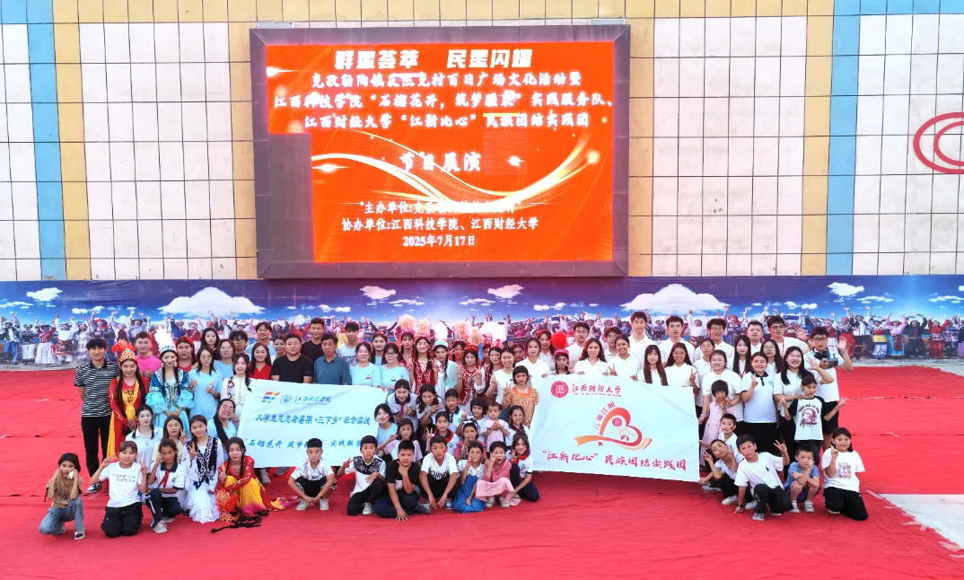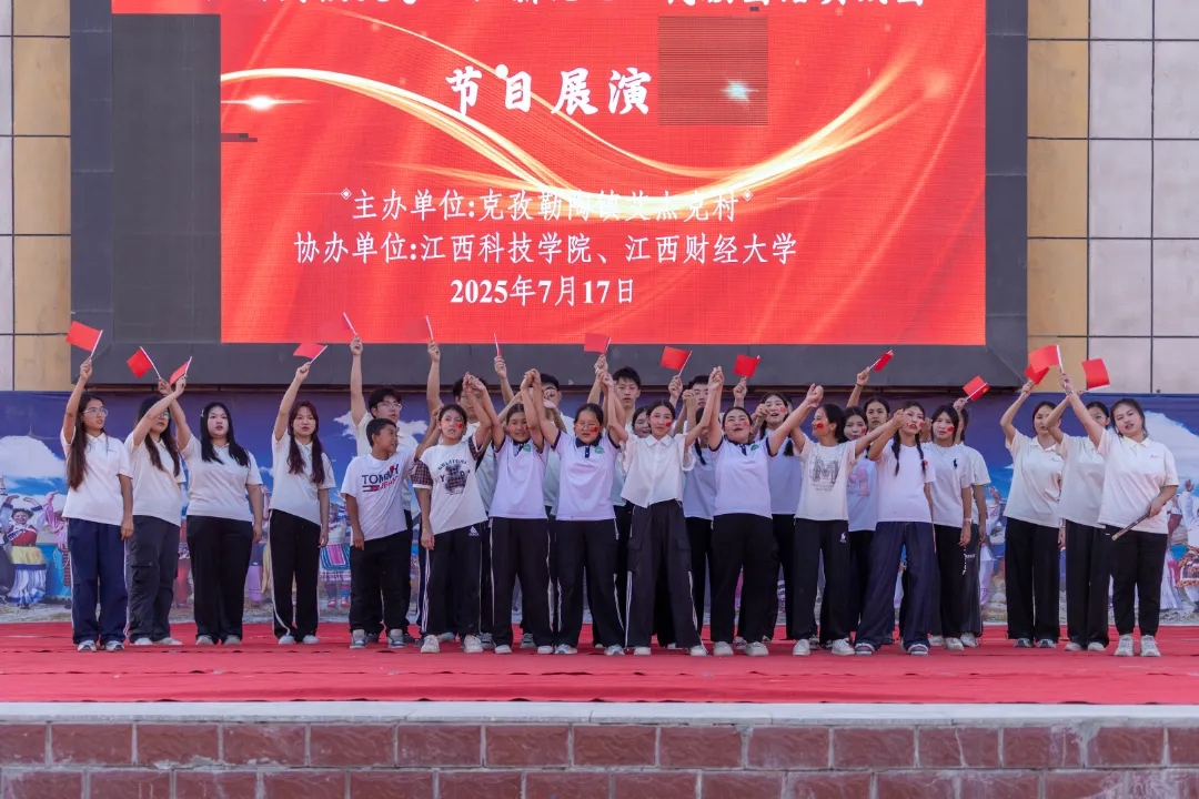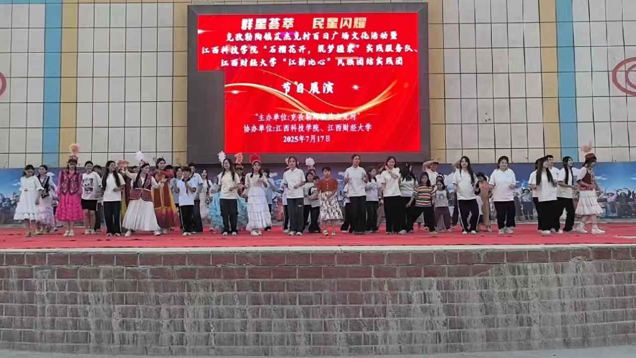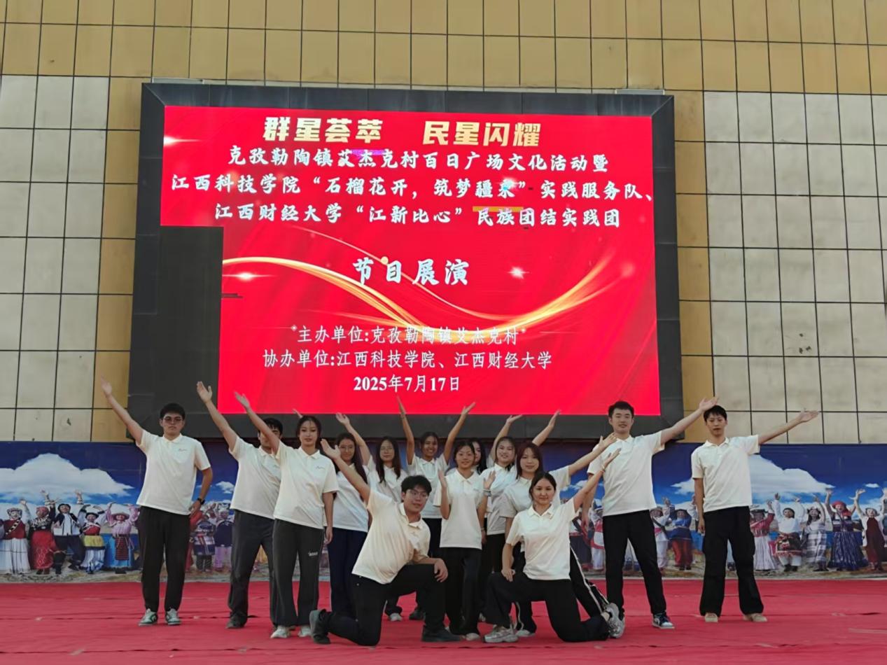 7月17日晚,由阿克陶县克孜勒陶镇艾杰克村村委会主办、江西财经大学“江新比心”民族团结实践团与江西科技学院“石榴花开筑梦疆来”实践服务队联合承办的“百日广场文化活动——群星荟萃,民星闪耀”联欢会在丝路佳苑文化广场上演。江财“江新比心”民族团结实践团以歌声与舞步为媒,与克孜勒陶镇丝路佳苑小学的少先队员们共同献上了一场跨越地域的青春对话。