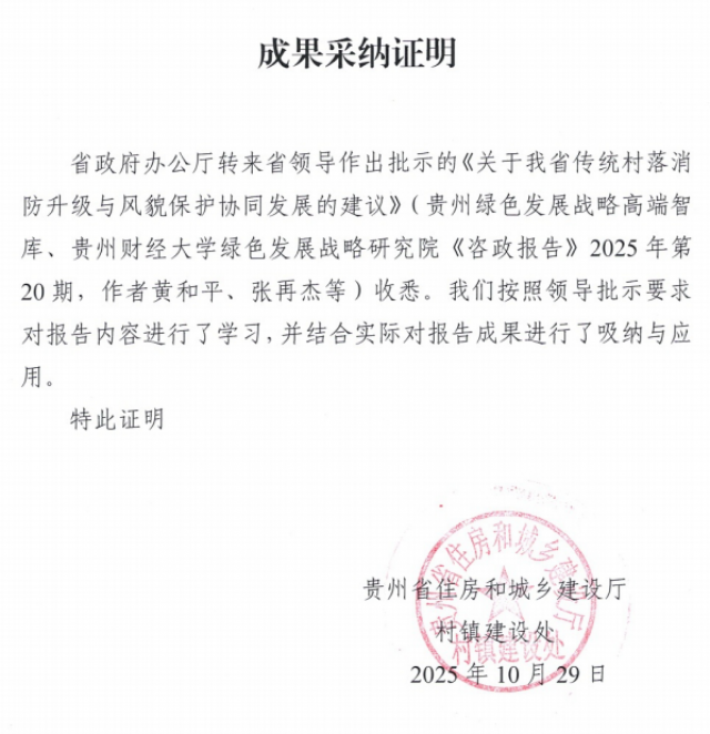 近日,由经济学院黄和平教授和贵州财经大学张再杰研究员等合作撰写的研究报告《关于我省传统村落消防消防升级与风貌保护协同发展的建议》获贵州省政府分管领导肯定性批示。该报告刊发于贵州绿色发展战略高端智库、贵州财经大学绿色发展战略研究院主办的《咨政报告》2025年第20期。贵州省住房和城乡建设厅村镇建设处已按领导批示要求对报告内容进行了学习,并结合实际对报告成果进行了吸纳和应用。