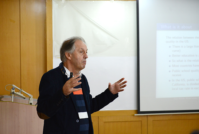 讲座围绕地区收入不平等与极化如何影响公共教育投资展开,在de la Croix研究的内生生育与教育选择理论模型基础上,Lubrano教授提出了一种简单且可同时估计不平等与极化程度的混合分布方法,通过此方法,研究发现不平等与极化都对社区公共教育投资有影响。通过分析美国加州724个学区的实证模型发现,收入极化会显著降低低收入地区的教育投入,而在高收入地区则是不平等起到相似作用。Lubrano教授的演讲生动有趣,台下在坐的师生在聆听的同时与Lubrano教授展开了多次深刻的讨论,讲座在轻松愉快而又不失严谨的气氛中圆满结束。