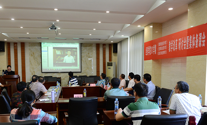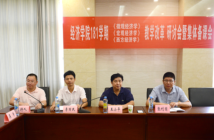 为了贯彻习近平总书记在全国教育大会上的重要讲话精神,适应我校建设一流本科教育的新要求,努力提高本科教育质量,9月14日上午,经济学院开展了《微观经济学》、《宏观经济学》、《西方经济学》三门基本经济理论课程的教学改革研讨会暨集体备课会。王小平副校长莅临指导,经济学院院长张利国致辞,三门课程的课程负责人和全体任课教师参加了会议,特邀超星江西分公司代表就慕课建设进行了辅导。分管教学的副院长胡德龙主持了本次会议。
