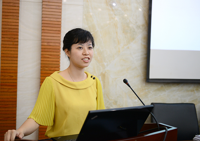 然后裘莹博士作了题为“生产性服务对价值链升级的非线性机理分析:来自邻近约束的视角”的学术报告。裘莹博士首先介绍了生产性服务在价值链升级中的重要作用与前期文献观点,进而介绍了自己的数据整理工作,并提出针对国际投入产出表高维数据结构的处理方法:多层线性模型,这种方法在考虑多维数据异质性的情况下可以纠正标准误差,得出更为精确的结论。在简单介绍了模型方法之后,裘莹博士进一步介绍了价值链从增加值出发的前向分解框架与邻近性指数测算方法,并报告了基准模型、异质性分析与内生性处理的数据结果,最后得到论文两大主要结论:证实了Francois(2008)生产性服务对价值链升级的倒U型非线性影响,并且通过区分“一带一路”国家与非“一带一路”国家发现收入水平提升将引起倒U型曲线的顶点向右移动。