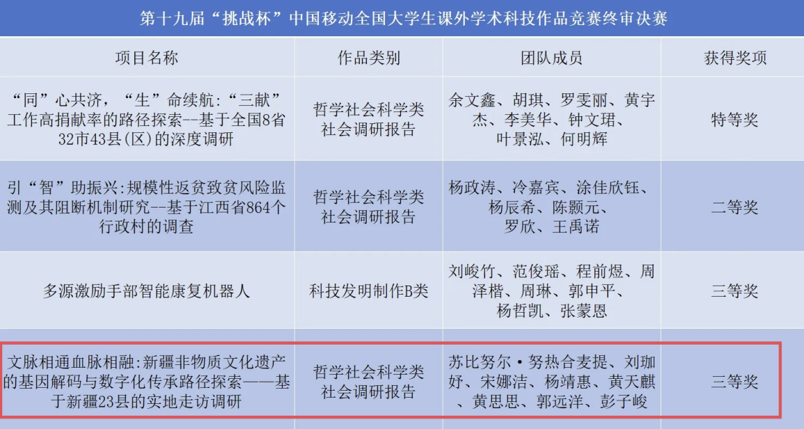 10月31日至11月3日,第十九届“挑战杯”中国移动全国大学生课外学术科技作品竞赛终审决赛在南京大学圆满落幕。经过全国各高校优秀团队的激烈角逐,经济学院团队凭借作品《文脉相通血脉相融:新疆非物质文化遗产的基因解码与数字化传承路径探索——基于新疆23县的实地走访调研》(指导老师:崔兴华、谢尔艾力·库尔班、万婧怡)荣获国家级三等奖,充分展现了我院学子深厚的理论素养、严谨的科研态度与强烈的时代担当,彰显了经济学院在服务国家战略需求、推动经济社会发展方面的人才培养成效。