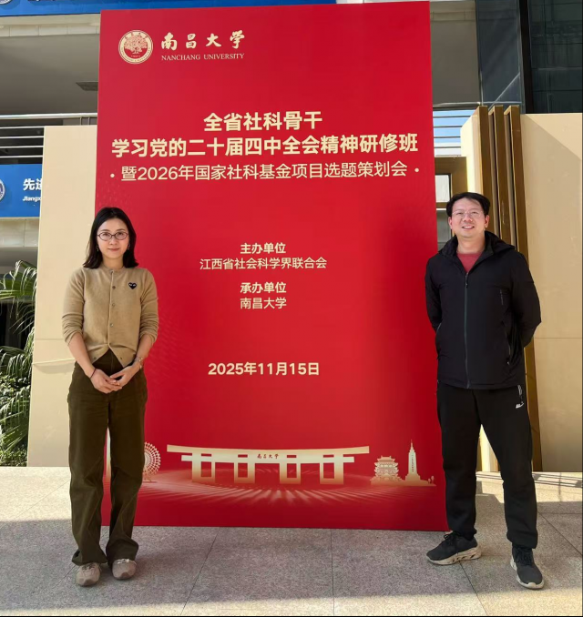 2025 年 11 月 15 日,全省社科骨干学习党的二十届四中全会精神研修班暨 2026 年国家社科基金项目选题策划会在南昌大学前湖校区成功举办。本次会议由省社科联与南昌大学联合主办,来自省属本科高校、省直科研机构、省直有关单位及部分民办高校的科研管理负责人、2026 年国家社科基金项目申报者代表等 260 余人齐聚一堂,共学全会精神、共研选题方向。我院教师卢阳博士和徐慧博士参加。