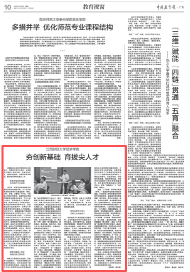 近日,《中国教育报》以题为“江西财经大学经济学院:夯创新基础,育拔尖人才”报道了我院“经济学拔尖人才实验班”培养特色做法。